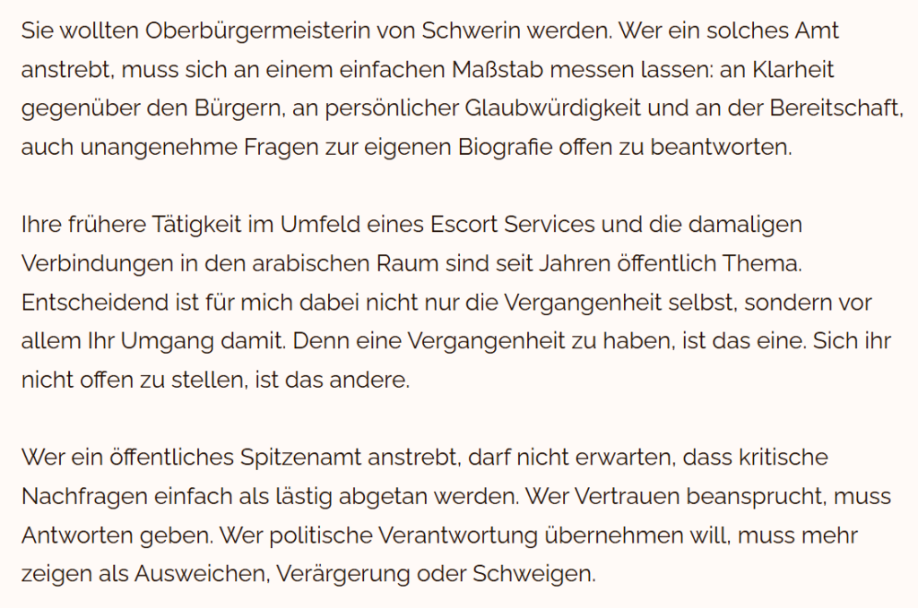 In der Schweriner AfD kracht es derzeit. Nach der Niederlage für OB-Kandidatin Petra Federau um den höchsten Posten im Stadthaus taucht jetzt ein offener Brief eines AfD-Mitglieds auf, der die Vorsitzende des Kreisverbandes mit harter Kritik konfrontiert. Federau reagiert kühl. (…) Unter Schweriner Politik-Insidern war die AfD-Kandidatin in der Stichwahl erwartet worden. Jetzt kam es anders, für viele überraschend. Im Nachgang zur Wahlschlappe zeigt sich nun allerdings auch öffentlich, dass nicht alle Mitglieder der eigenen Partei auch hinter ihrer Kandidatin standen. Was in den vergangenen Monaten noch hinter vorgehaltener Hand getuschelt wurde, wird jetzt öffentlich. Robert Zobel ist Mitglied des AfD-Kreisverbandes Schwerin, Autor und sachkundiger Bürger in Ausschüssen der Stadt. Er hat im Internet jetzt einen offenen Brief an Petra Federau veröffentlicht, der der Redaktion vorliegt. Mit scharfer Kritik an der Vorsitzenden des AfD-Kreisverbandes. Seine offiziellen Ämter in Stellvertreterpositionen wolle er abgeben. „Ich habe mich politisch nicht eingebracht, um zu schweigen, zu nicken und unbequeme Dinge für mich zu behalten, sondern weil ich davon ausging, dass politische Arbeit auch bedeutet, Fragen stellen zu dürfen. Gerade dann, wenn es um Glaubwürdigkeit, Aufrichtigkeit und Verantwortung geht“, schreibt er. Federaus Escort-Vergangenheit nicht aufgeklärt Konkret geht es um die Reaktionen Federaus im Vorfeld zur Wahl, als sie Medienanfragen zu ihrer Escort-Vergangenheit, als sie Frauen in arabische Länder vermittelt haben soll, nicht beantworten wollte. „Entscheidend ist für mich dabei nicht nur die Vergangenheit selbst, sondern vor allem Ihr Umgang damit. Denn eine Vergangenheit zu haben, ist das eine. Sich ihr nicht offen zu stellen, ist das andere“, schreibt Zobel an Federau in seinem Brief. Wer ein öffentliches Spitzenamt anstrebe, dürfe nicht erwarten, dass kritische Nachfragen einfach als lästig abgetan werden können