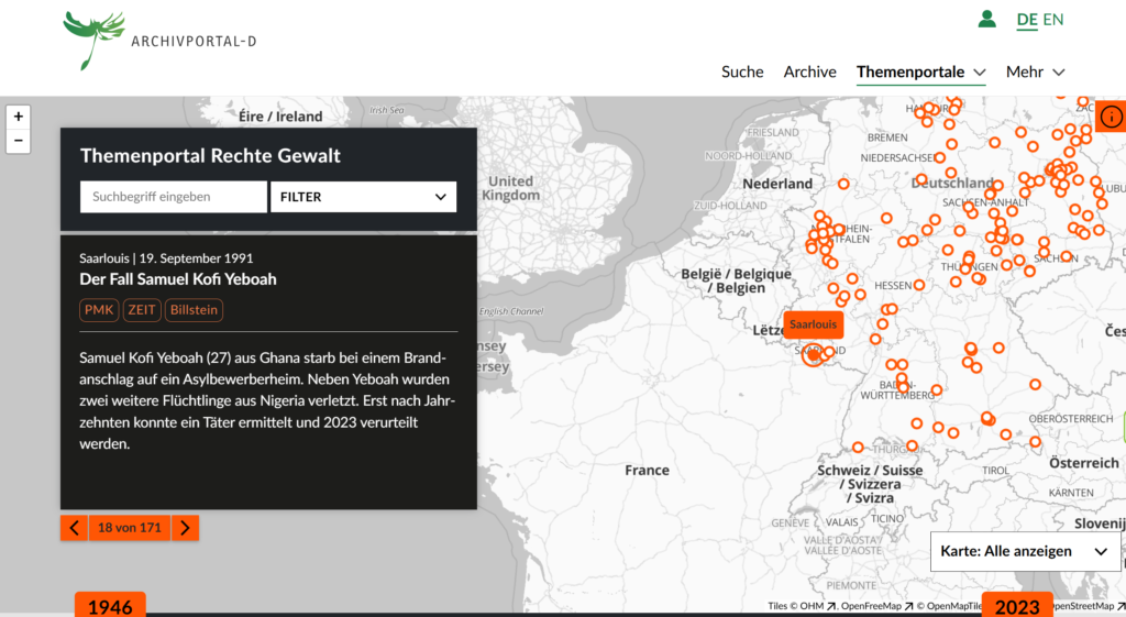 Die Mordserie der Neonazi-Terrorgruppe NSU ist vielen noch im Bewusstsein. Andere Taten sind es hingegen kaum. Ein neues Online-Angebot bietet einen Überblick über rechtsextreme Gewalt. Link kopiert Ein neues Online-Portal informiert über rechtsextreme Gewalt wie die NSU-Morde in Deutschland. Unter www.themenportal-rechtegewalt.de können Interessierte zu einschlägigen Gewalttaten seit 1945 recherchieren. Geplant ist ein weiterer Ausbau des digitalen Angebots, wie das Bundesarchiv am Montag mitteilte. Es zählt zusammen mit dem Landesarchiv Baden-Württemberg und dem Leibniz-Institut für Informationsinfrastruktur zu den Trägern des Projekts. “Das Portal ‘Rechte Gewalt’ leistet einen wichtigen Beitrag zur Dokumentation und Aufarbeitung in Deutschland sowie zur Sensibilisierung mit Blick auf fremdenfeindliche und rechtsextremistische Entwicklungen in der Gegenwart”, sagte der Präsident des Bundesarchivs, Michael Hollmann.